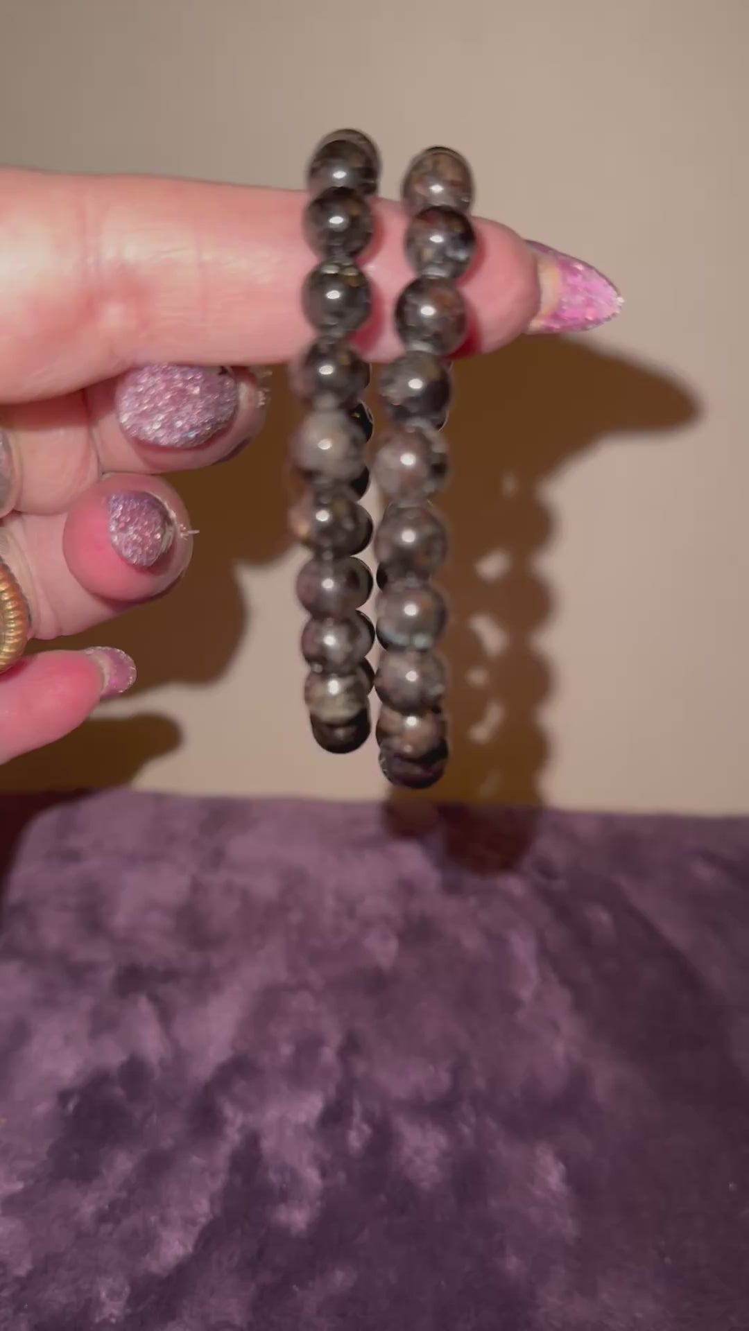 Arfvedsonite with gem grade Garnet inclusions is a more rare combination of minerals that crystallize together. While the Arfvedsonite provides a dark fibrous matrix with unique blue flashes, the garnet inclusions appear as smaller, red specs making for a striking contrast. In this particular composite stone, the grade is not determined by the lack of inclusion, but rather the quality of the inclusion. The brilliance of the flash and the clarity of the garnet is what determines that these are high-quality bracelets. Interesting to examine each bead with a flashlight to see the brilliant blue fireworks and vibrant red Garnet. If you’re purchasing this item as a gift, please visit our Miscellaneous Collection as we carry a nice selection of gift boxes at a very reasonable price.