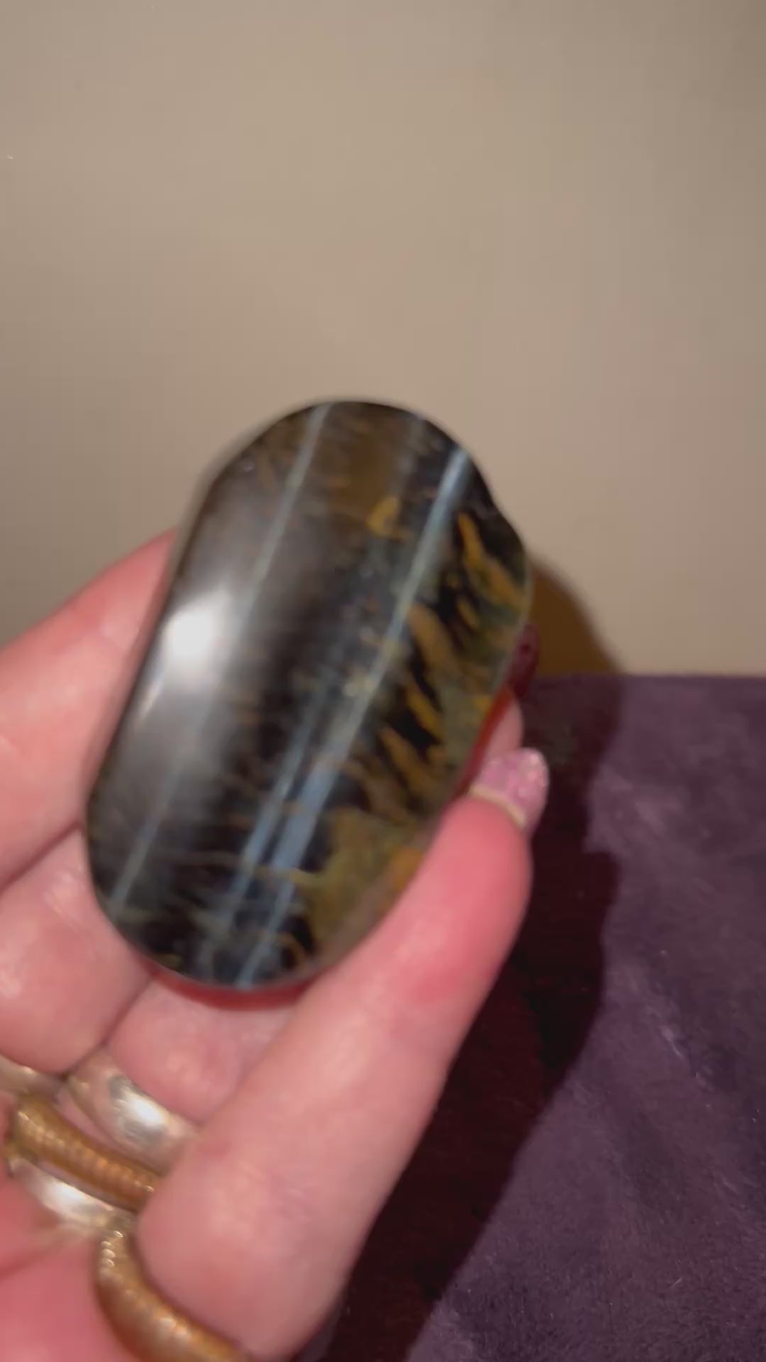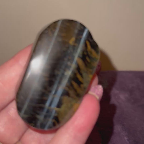 The amazing shimmer of these blue tiger eye palm stones is sure to ease any anxieties or to help with meditation. Are you a fidgeter? This is a great stone to keep close. So many beautiful attributes to focus on . WireNot to mention their beautiful appearance and enhancing any collection. And what a wonderful gift for that someone special someone. Choose your favorite piece by letter. You can’t go wrong with either. A. 2.5” x 2.5” x.75” Weighing 3 ozs B. 2.5” x 1.5” x .75”. 2.5 ozs.