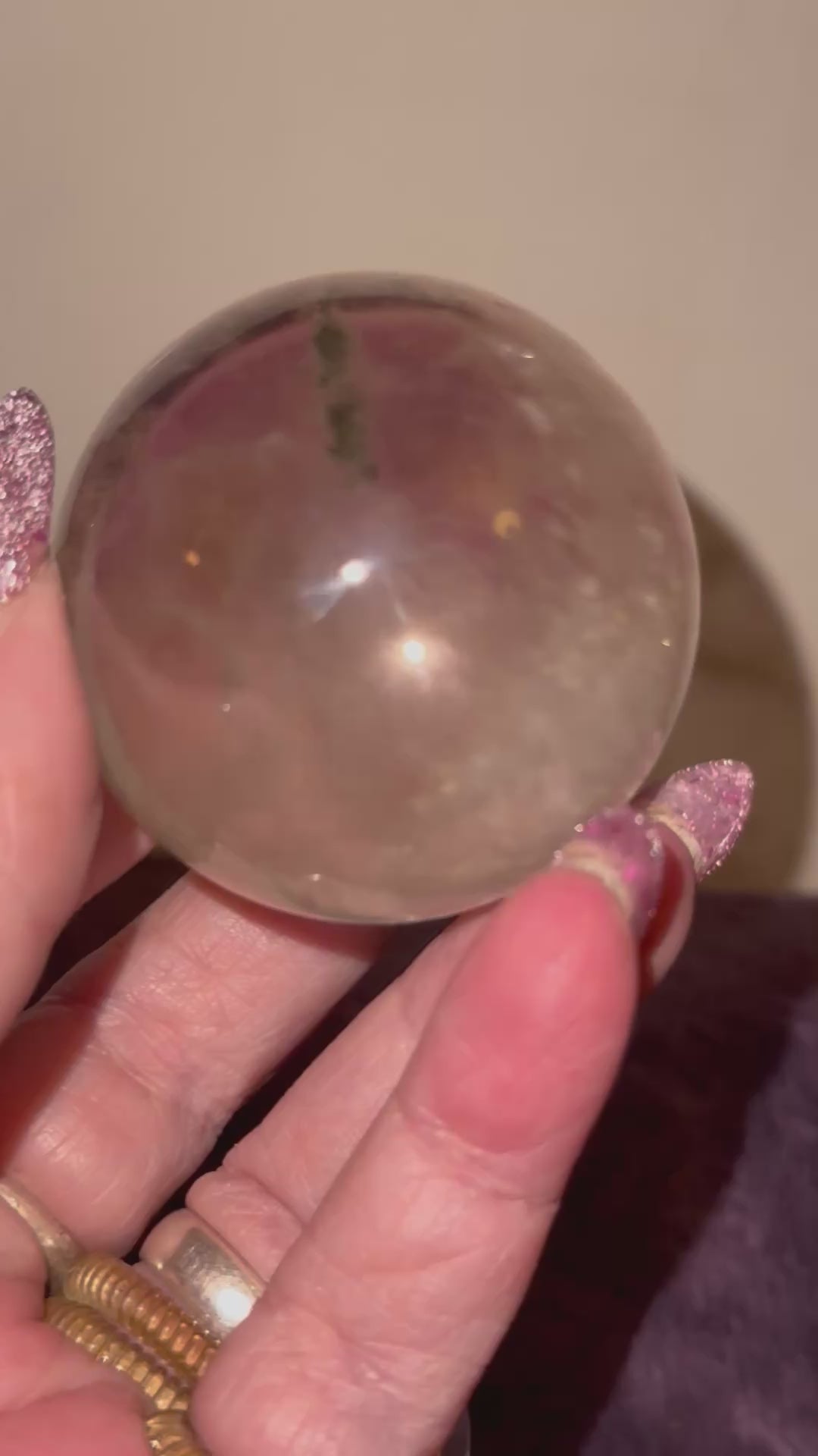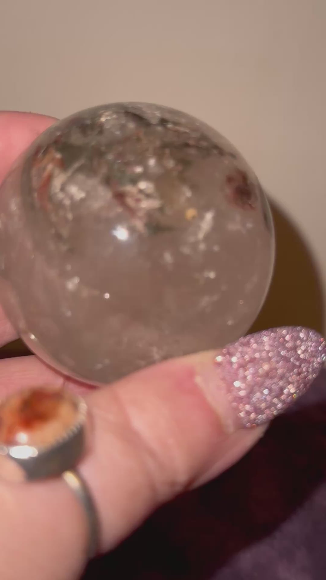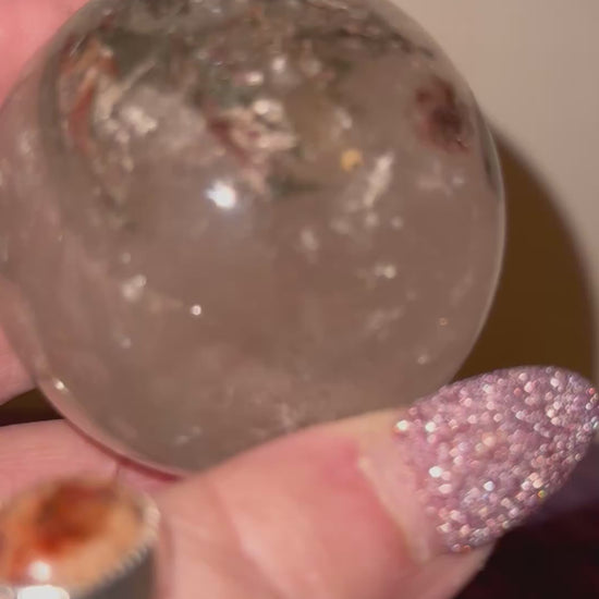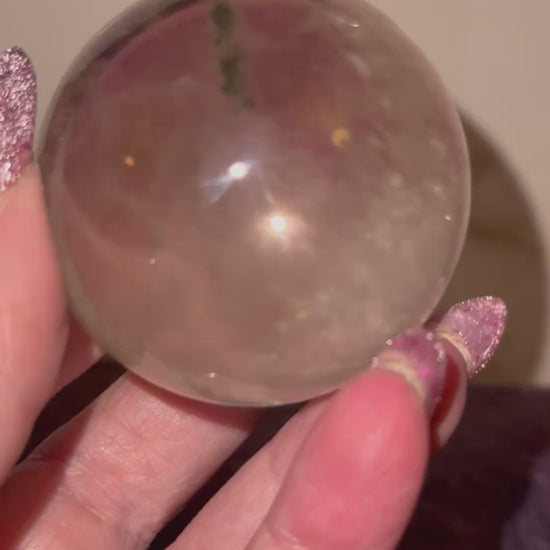 To completely beautiful yet different garden courts spheres available. A is beautiful four seasons garden while B. has a smaller amount of green and white garden. Both spheres are beautifully clear, full of fractures and regrowth, which emit, beautiful rainbows. Either sphere would be an amazing addition to any collection or the perfect gift for that someone special. Choose your favorite by letter. A. 55 mm weighing 8.3 ozs. B. 52 mm weighing 6.9 ozs.