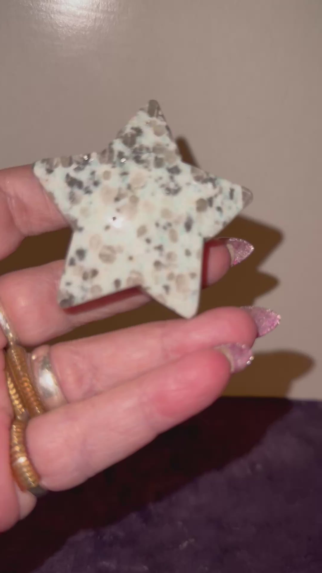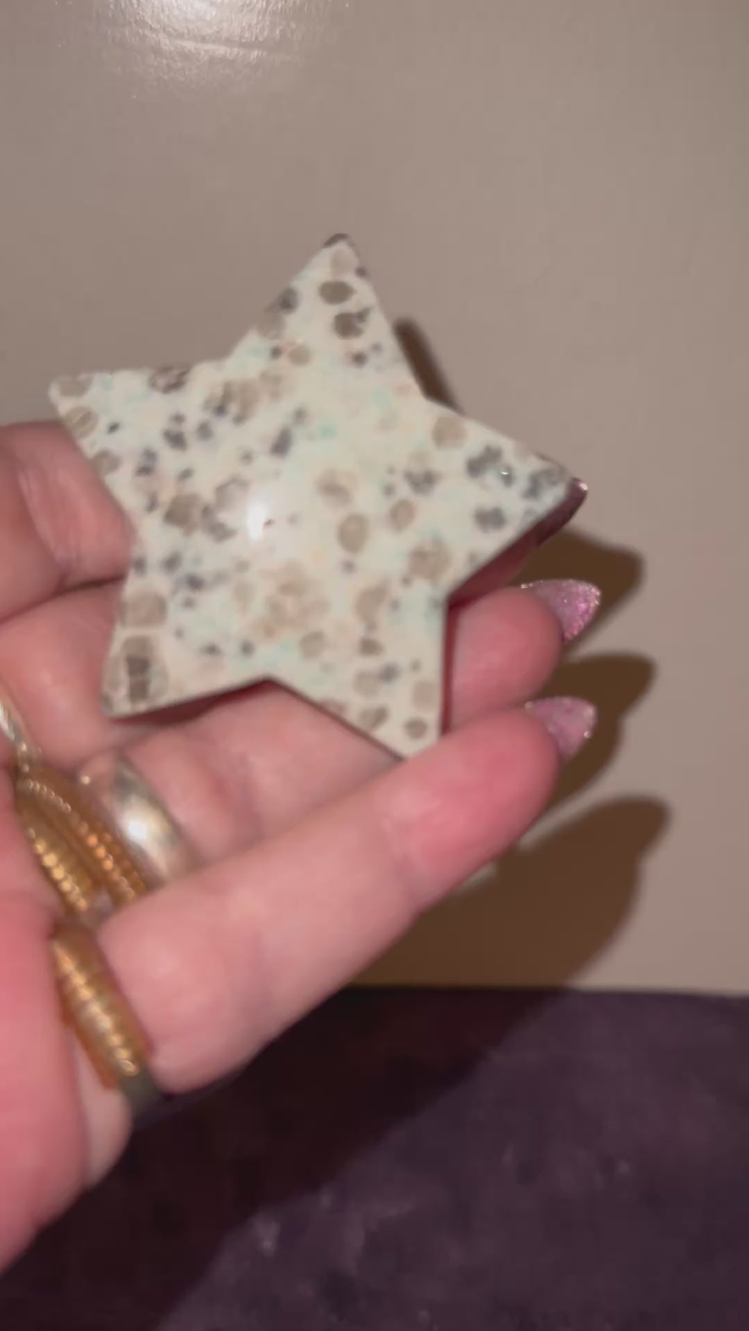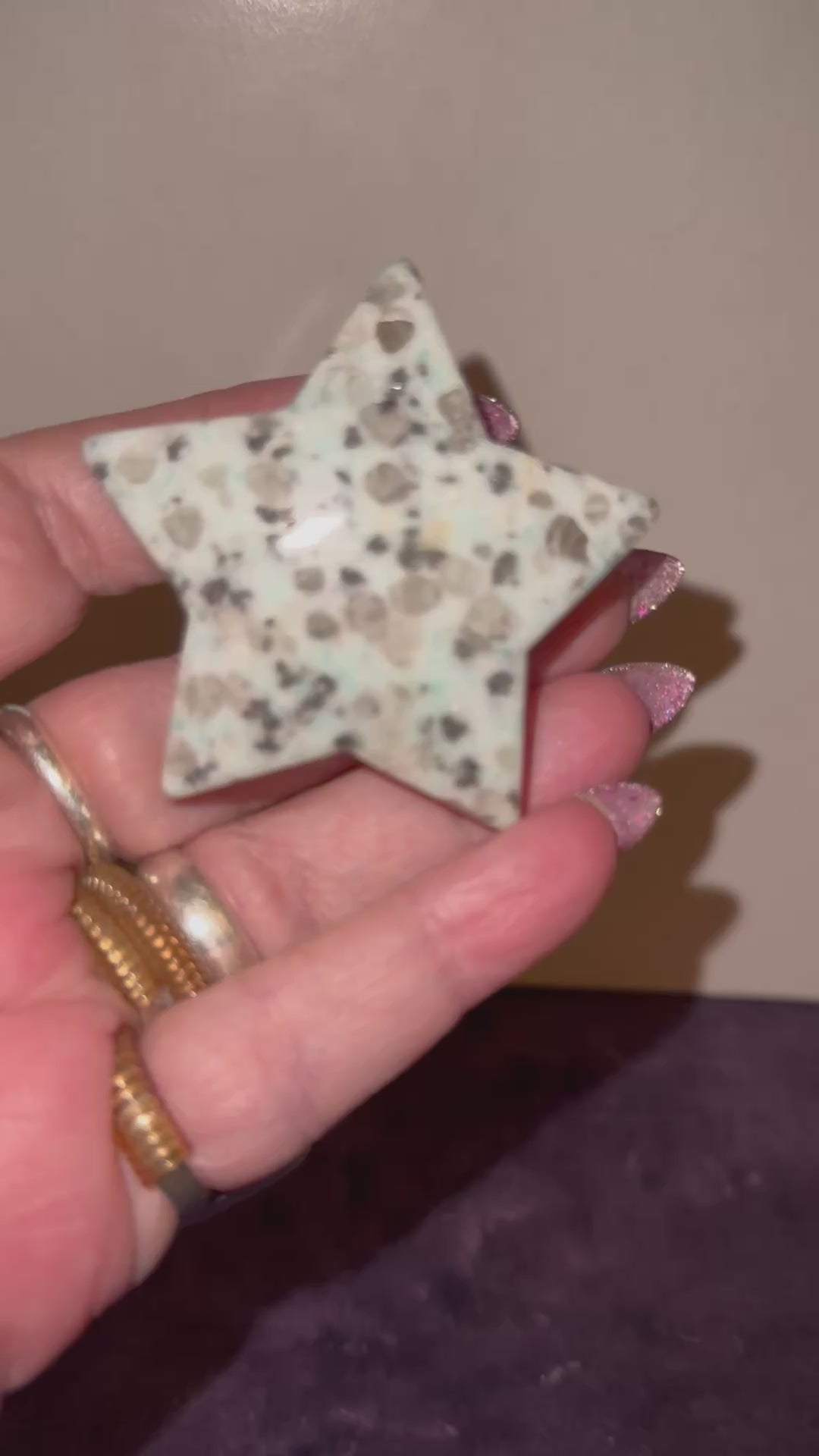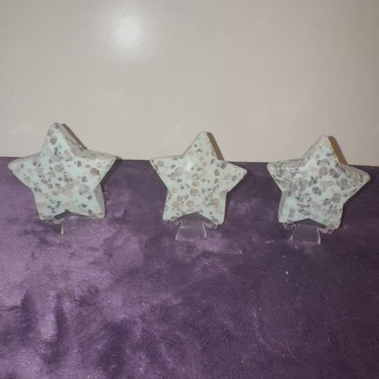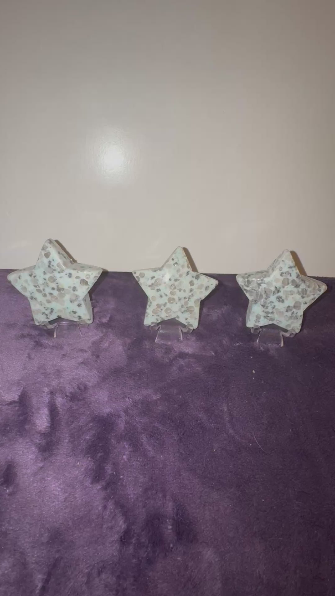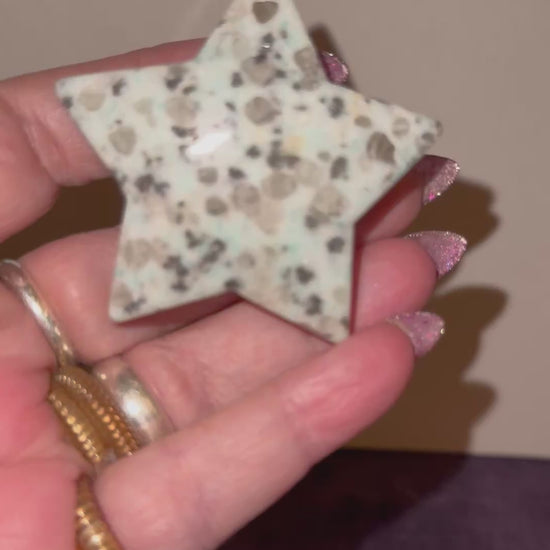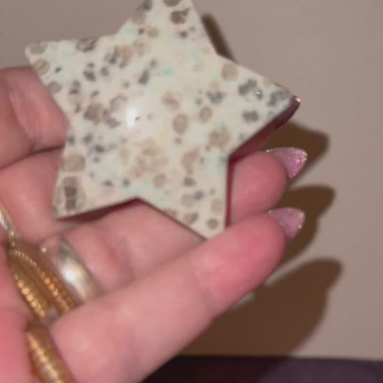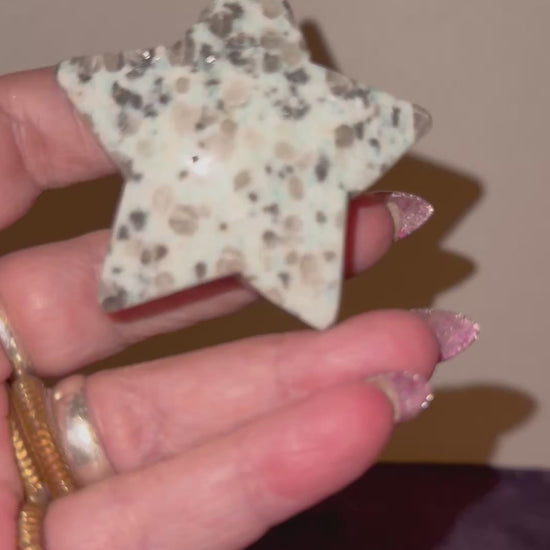 These stars are beautiful specimens of kiwi Jasper. Though Keeley is not truly a Jasper more of a composite stone like granite. The pale minty green color comes from a combination of Amazon night and Feld’s bar, and the dark spots are black tourmaline while the more pale are a combination of quartz and Felspar. The symbolism of a star shaped can vary from one culture to the other, but primarily includes Hope, guidance and spiritual enlightenment. The calming color and symbolism of these beautiful kiwi stars are short to enhance any collection and would make the perfect gift for any occasion. If you need any of our items shipped to an address, other than your own, please message us with the recipients, full name and mailing address and whether you would like a note included as we offer drop shipping at no additional cost.