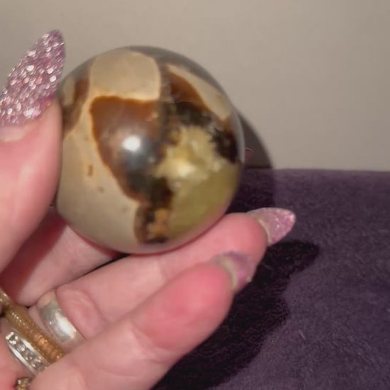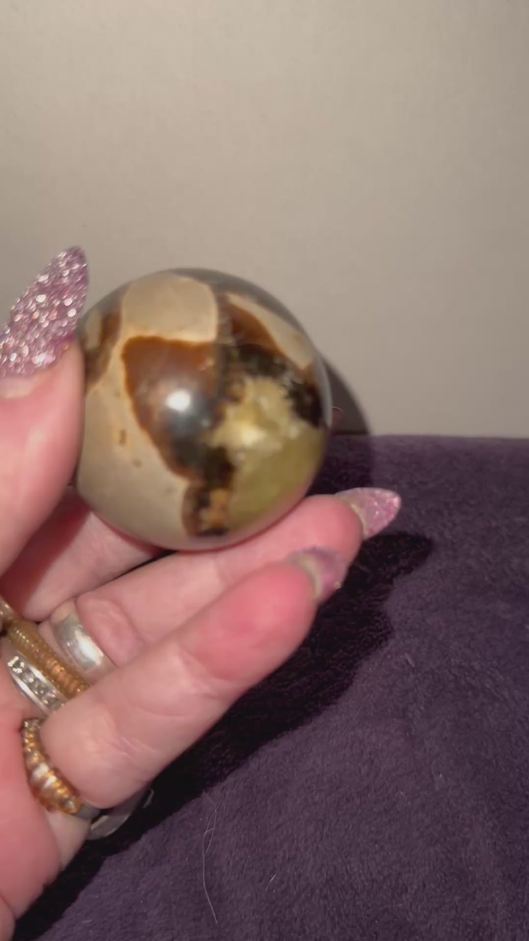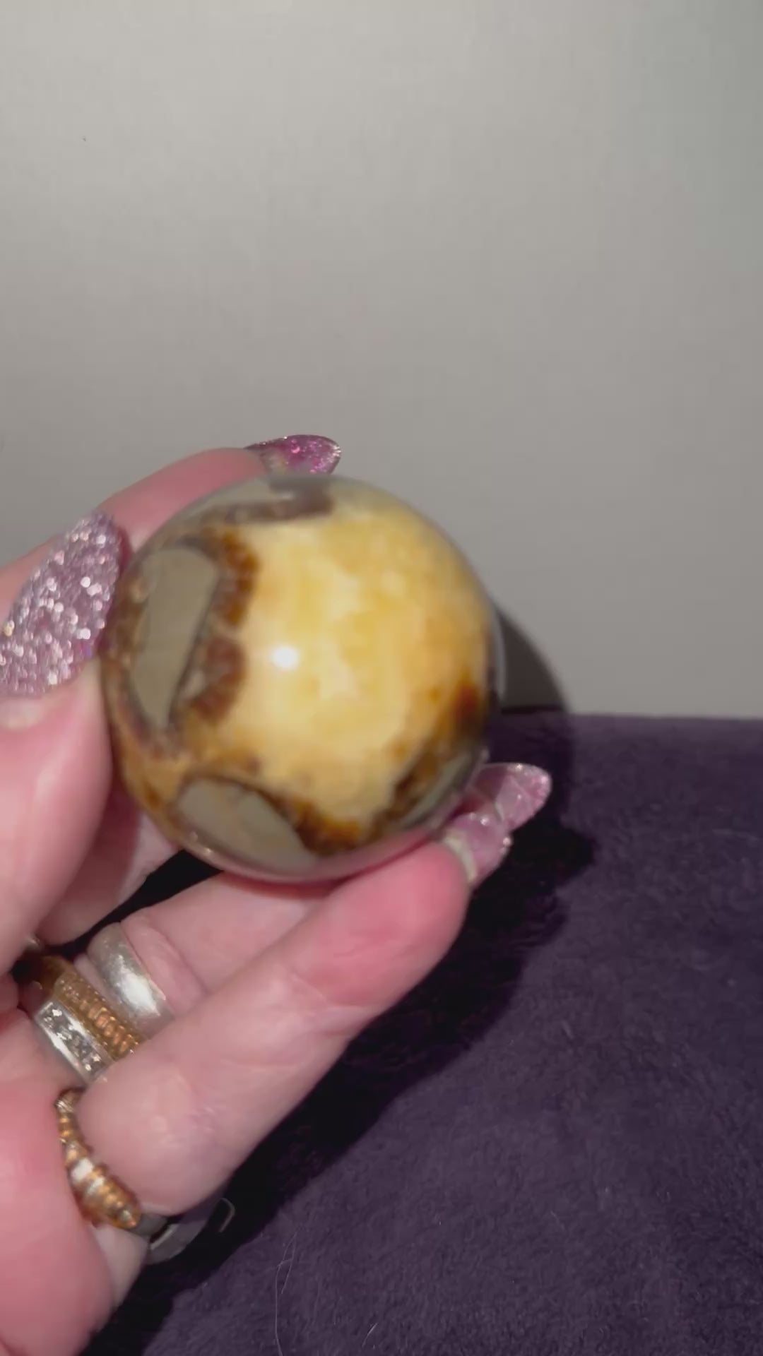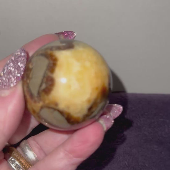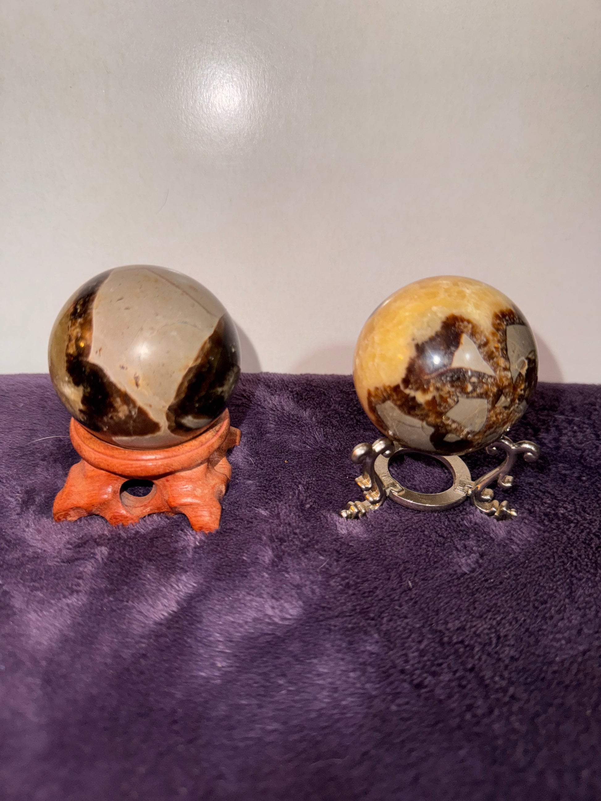 Vibrant Yellow Calcite and Interesting Designs of Aragonite ( the dark brown designs ) , the gray being the matrix. The Calcite and Aragonite glow beautify under a UV light. Please choose your favorite by letter. A.