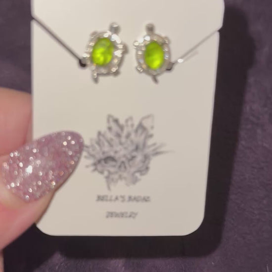 Sweet little Peridot Turtle Earrings are suitable for adults or older children. A bit too big for infants and toddlers. Approximately 17mm x 10mm. s925 post. If purchasing as a gift please visit our Miscellaneous Collection. We sell a nice collection of gift boxes at very affordable prices.